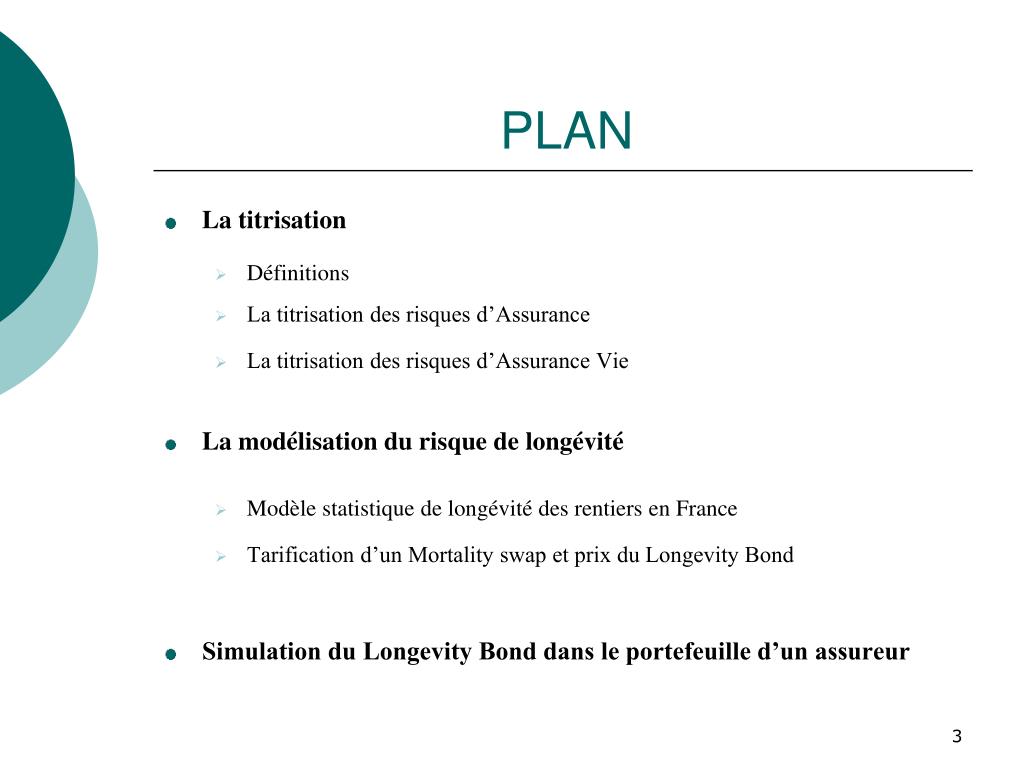 PLAN • La titrisation • Définitions • La titrisation des risques d’Assurance • La titrisation des risques d’Assurance Vie • La modélisation du risque de longévité • Modèle statistique de longévité des rentiers en France • Tarification d’un Mortality swap et prix du Longevity Bond • Simulation du Longevity Bond dans le portefeuille d’un assureur