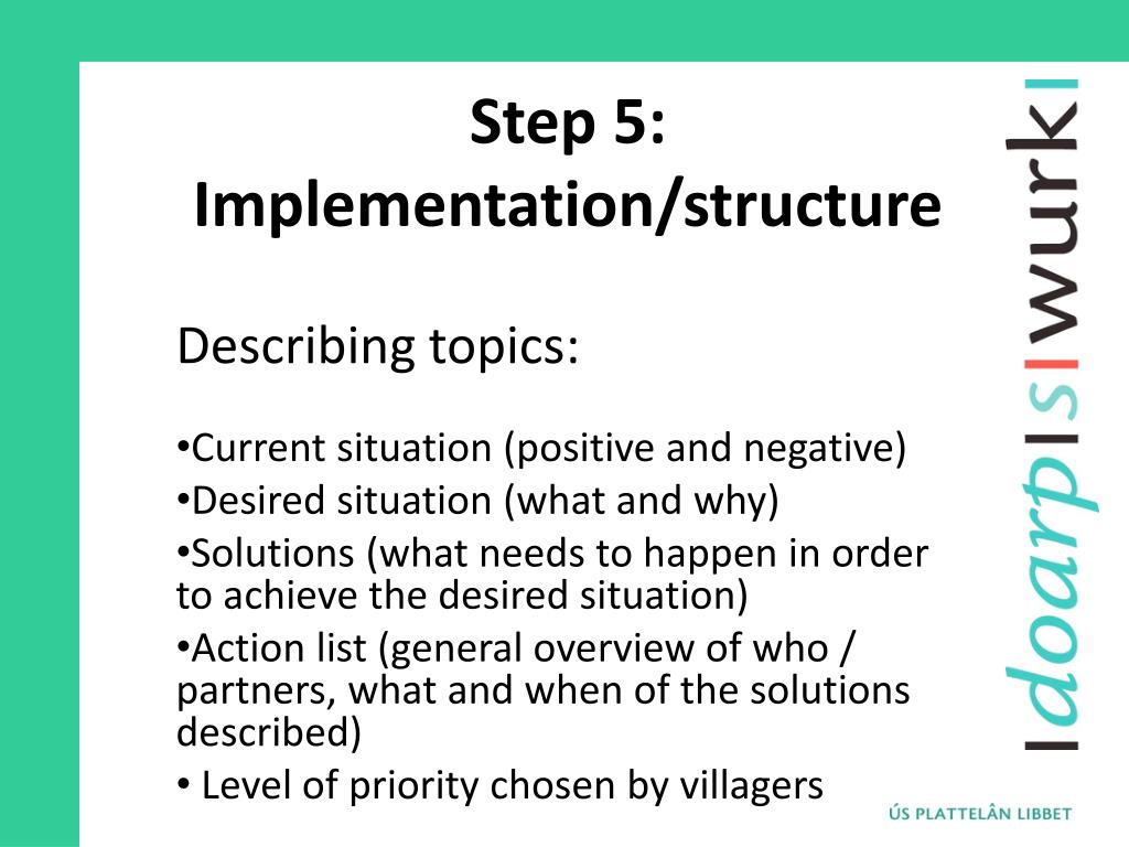 Step 5: Implementation/structure Describing topics: Current situation (positive and negative) Desired situation (what and why) Solutions (what needs to happen in order to achieve the desired situation) Action list (general overview of who / partners, what and when of the solutions described) Level of prioritychosenby villagers