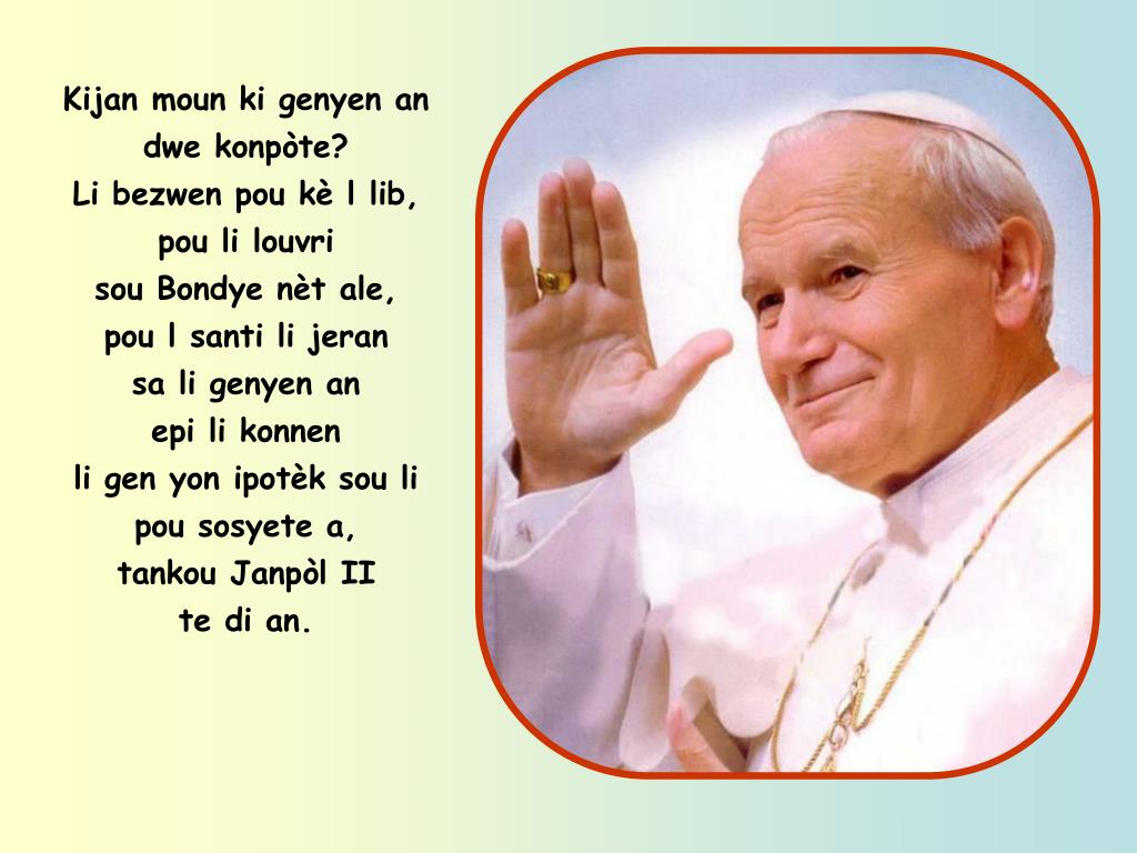 Kijan moun ki genyen an dwe konpòte? Li bezwen pou kè l lib, pou li louvri sou Bondye nèt ale, pou l santi li jeran sa li genyen an epi li konnen li gen yon ipotèk sou li pou sosyete a, tankou Janpòl II te di an.