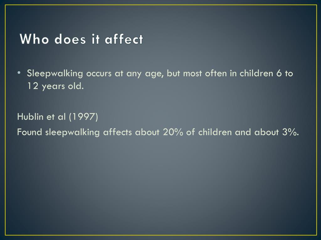 Who does it affect • Sleepwalking occurs at any age, but most often in children 6 to 12 years old. Hublin et al (1997) Found sleepwalking affects about 20% of children and about 3%.