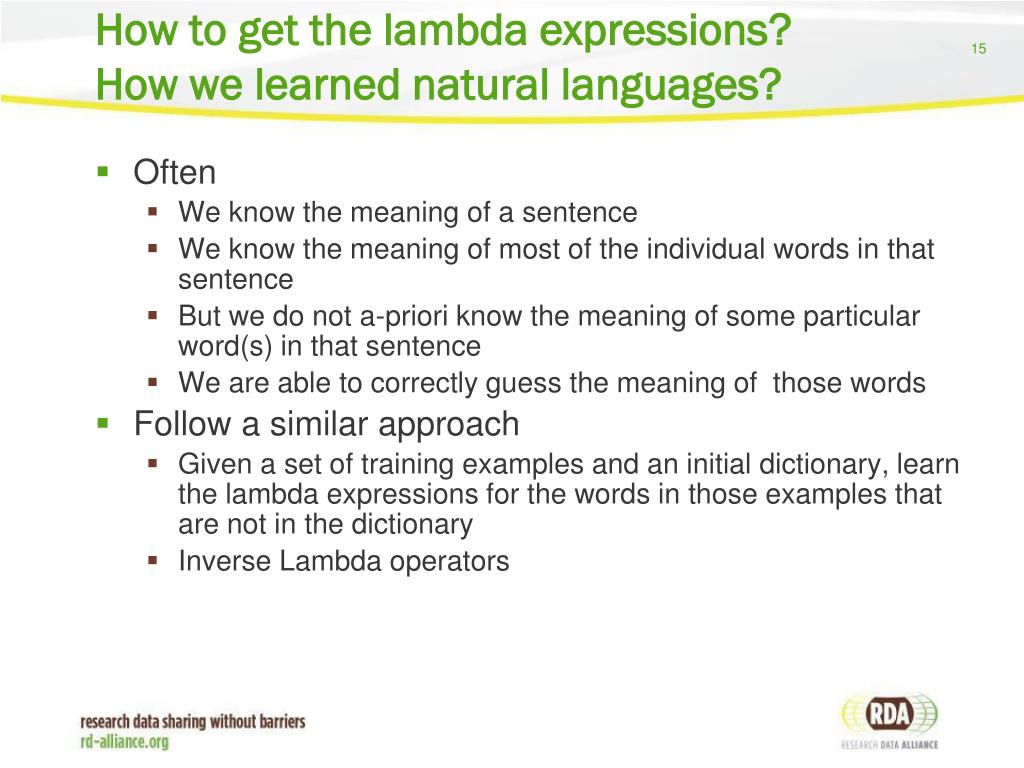 How to get the lambda expressions? How we learned natural languages? • Often • We know the meaning of a sentence • We know the meaning of most of the individual words in that sentence • But we do not a-priori know the meaning of some particular word(s) in that sentence • We are able to correctly guess the meaning of those words • Follow a similar approach • Given a set of training examples and an initial dictionary, learn the lambda expressions for the words in those examples that are not in the dictionary • Inverse Lambda operators