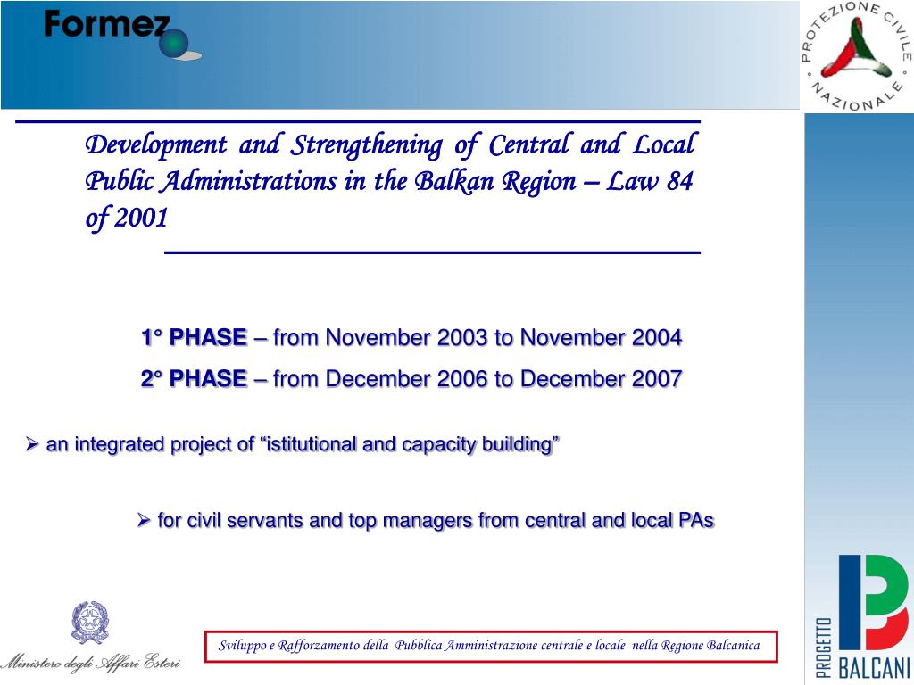 Development and Strengthening of Central and Local Public Administrations in the Balkan Region – Law 84 of 2001 1° PHASE – from November 2003 to November 2004 2° PHASE – from December 2006 to December 2007 • an integrated project of “istitutional and capacity building” • for civil servants and top managers from central and local PAs