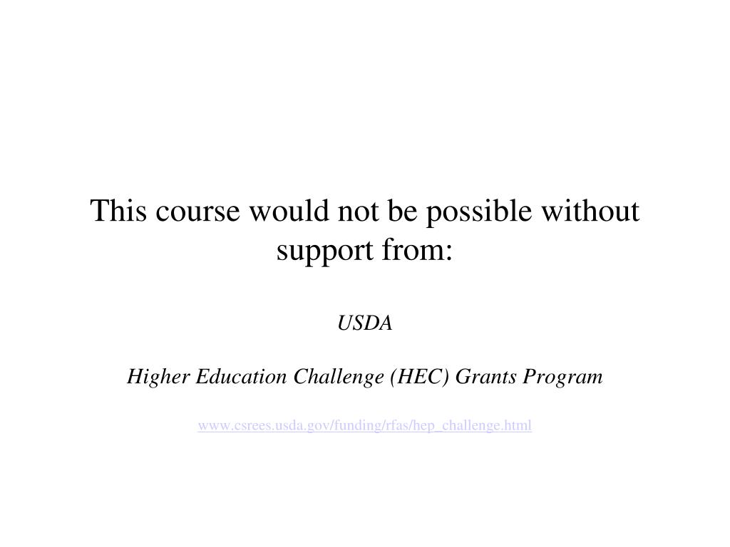 This course would not be possible without support from: USDA Higher Education Challenge (HEC) Grants Program www.csrees.usda.gov/funding/rfas/hep_challenge.html