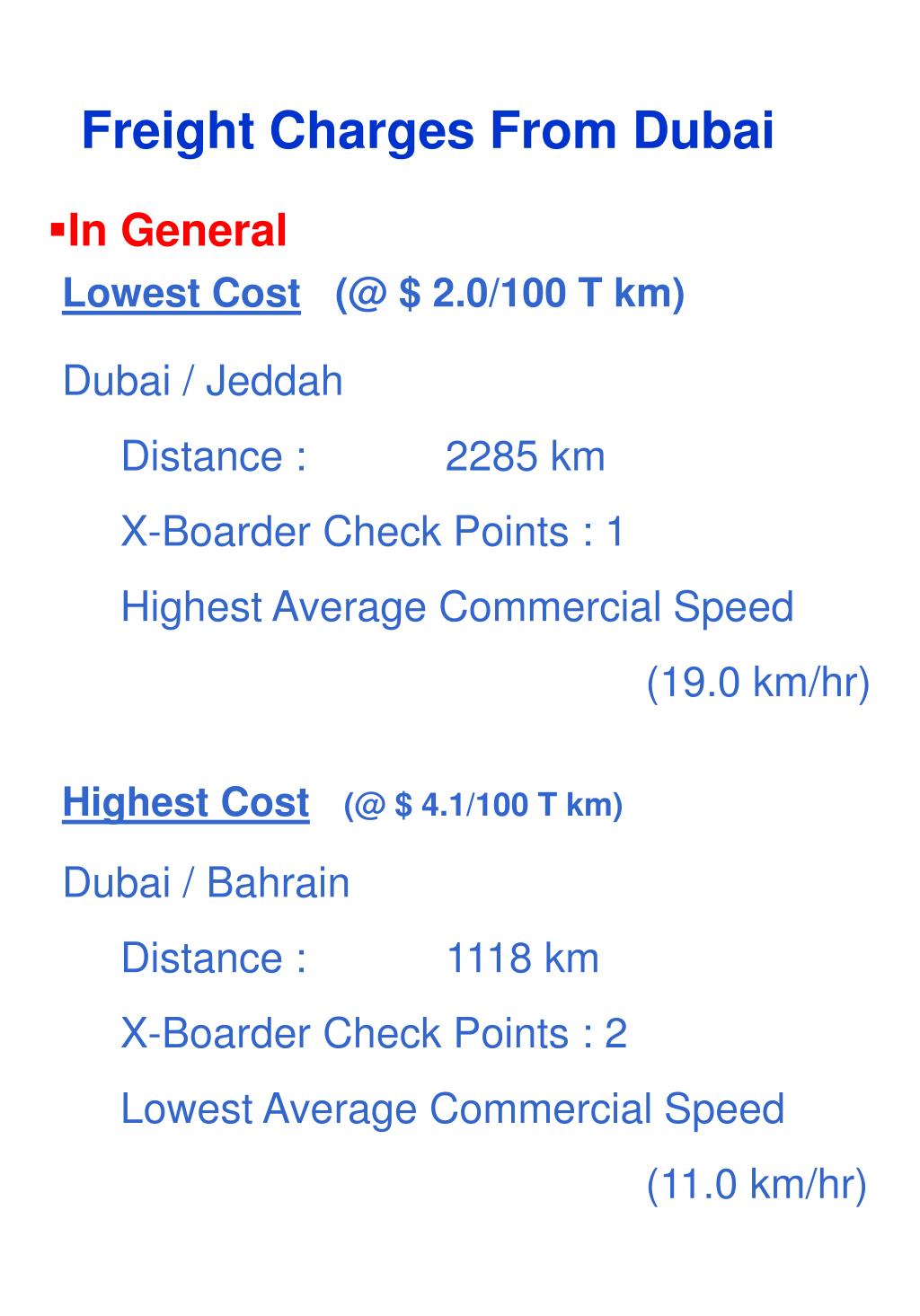 Freight Charges From Dubai • In General Lowest Cost (@ $ 2.0/100 T km) Dubai / Jeddah Distance : 2285 km X-Boarder Check Points : 1 Highest Average Commercial Speed (19.0 km/hr) Highest Cost(@ $ 4.1/100 T km) Dubai / Bahrain Distance : 1118 km X-Boarder Check Points : 2 Lowest Average Commercial Speed (11.0 km/hr)