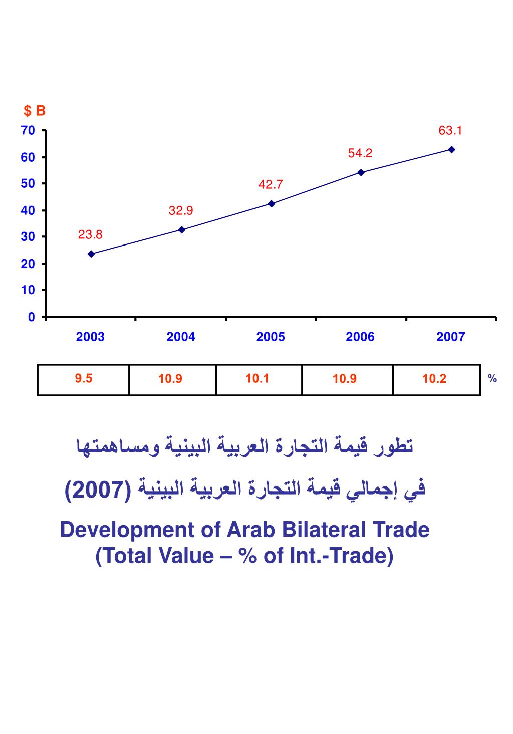 $ B 2008 9.5 10.1 10.9 10.9 10.2 % تطور قيمة التجارة العربية البينية ومساهمتها في إجمالي قيمة التجارة العربية البينية (2007) Development of Arab Bilateral Trade (Total Value – % of Int.-Trade)