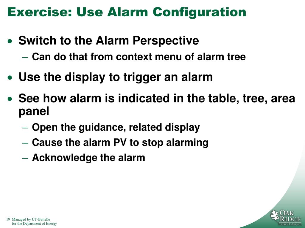 Exercise: Use Alarm Configuration • Switch to the Alarm Perspective • Can do that from context menu of alarm tree • Use the display to trigger an alarm • See how alarm is indicated in the table, tree, area panel • Open the guidance, related display • Cause the alarm PV to stop alarming • Acknowledge the alarm