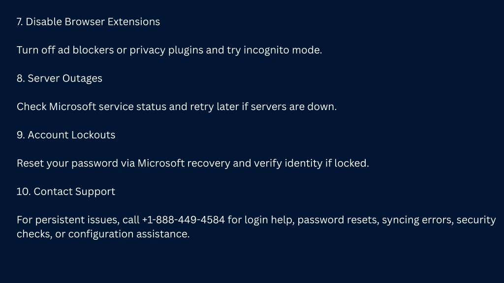 7. Disable Browser Extensions Turn off ad blockers or privacy plugins and try incognito mode. 8. Server Outages Check Microsoft service status and retry later if servers are down. 9. Account Lockouts Reset your password via Microsoft recovery and verify identity if locked. 10. Contact Support For persistent issues, call +1-888-449-4584 for login help, password resets, syncing errors, security checks, or configuration assistance.