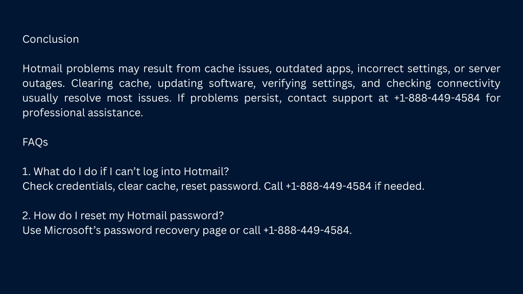 Conclusion Hotmail problems may result from cache issues, outdated apps, incorrect settings, or server outages. Clearing cache, updating software, verifying settings, and checking connectivity usually resolve most issues. If problems persist, contact support at +1-888-449-4584 for professional assistance. FAQs 1. What do I do if I can’t log into Hotmail? Check credentials, clear cache, reset password. Call +1-888-449-4584 if needed. 2. How do I reset my Hotmail password? Use Microsoft’s password recovery page or call +1-888-449-4584.