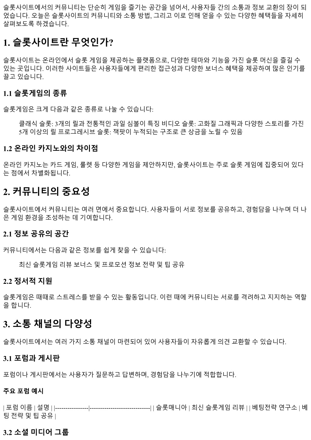 슬롯사이트에서의커뮤니티는단순히게임을즐기는공간을넘어서, 사용자들간의소통과정보교환의장이되 었습니다. 오늘은슬롯사이트의커뮤니티와소통방법, 그리고이로인해얻을수있는다양한혜택들을자세히 살펴보도록하겠습니다. 1. 슬롯사이트란무엇인가? 슬롯사이트는온라인에서슬롯게임을제공하는플랫폼으로, 다양한테마와기능을가진슬롯머신을즐길수 있는곳입니다. 이러한사이트들은사용자들에게편리한접근성과다양한보너스혜택을제공하여많은인기를 끌고있습니다. 1.1 슬롯게임의종류 슬롯게임은크게다음과같은종류로나눌수있습니다: 클래식슬롯: 3개의릴과전통적인과일심볼이특징비디오슬롯: 고화질그래픽과다양한스토리를가진 5개이상의릴프로그레시브슬롯: 잭팟이누적되는구조로큰상금을노릴수있음 1.2 온라인카지노와의차이점 온라인카지노는카드게임, 룰렛등다양한게임을제안하지만, 슬롯사이트는주로슬롯게임에집중되어있다 는점에서차별화됩니다. 2. 커뮤니티의중요성 슬롯사이트에서커뮤니티는여러면에서중요합니다. 사용자들이서로정보를공유하고, 경험담을나누며더나 은게임환경을조성하는데기여합니다. 2.1 정보공유의공간 커뮤니티에서는다음과같은정보를쉽게찾을수있습니다: 최신슬롯게임리뷰보너스및프로모션정보전략및팁공유 2.2 정서적지원 슬롯게임은때때로스트레스를받을수있는활동입니다. 이런때에커뮤니티는서로를격려하고지지하는역할 을합니다. 3. 소통채널의다양성 슬롯사이트에서는여러가지소통채널이마련되어있어사용자들이자유롭게의견교환할수있습니다. 3.1 포럼과게시판 포럼이나게시판에서는사용자가질문하고답변하며, 경험담을나누기에적합합니다. 주요포럼예시 | 포럼이름 | 설명 | |----------------|-----------------------------| | 슬롯매니아 | 최신슬롯게임리뷰 | | 베팅전략연구소 | 베 팅전략및팁공유 | 3.2 소셜미디어그룹