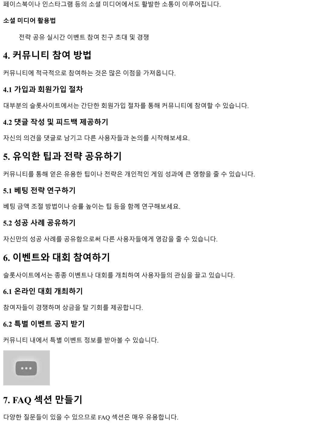 페이스북이나인스타그램등의소셜미디어에서도활발한소통이이루어집니다.페이스북이나인스타그램등의소셜미디어에서도활발한소통이이루어집니다. 소셜미디어활용법 전략공유실시간이벤트참여친구초대및경쟁 4. 커뮤니티참여방법 커뮤니티에적극적으로참여하는것은많은이점을가져옵니다. 4.1 가입과회원가입절차 대부분의슬롯사이트에서는간단한회원가입절차를통해커뮤니티에참여할수있습니다. 4.2 댓글작성및피드백제공하기 자신의의견을댓글로남기고다른사용자들과논의를시작해보세요. 5. 유익한팁과전략공유하기 커뮤니티를통해얻은유용한팁이나전략은개인적인게임성과에큰영향을줄수있습니다. 5.1 베팅전략연구하기 베팅금액조절방법이나승률높이는팁등을함께연구해보세요. 5.2 성공사례공유하기 자신만의성공사례를공유함으로써다른사용자들에게영감을줄수있습니다. 6. 이벤트와대회참여하기 슬롯사이트에서는종종이벤트나대회를개최하여사용자들의관심을끌고있습니다. 6.1 온라인대회개최하기 참여자들이경쟁하며상금을탈기회를제공합니다. 6.2 특별이벤트공지받기 커뮤니티내에서특별이벤트정보를받아볼수있습니다. 7. FAQ 섹션만들기 다양한질문들이있을수있으므로 FAQ 섹션은매우유용합니다.