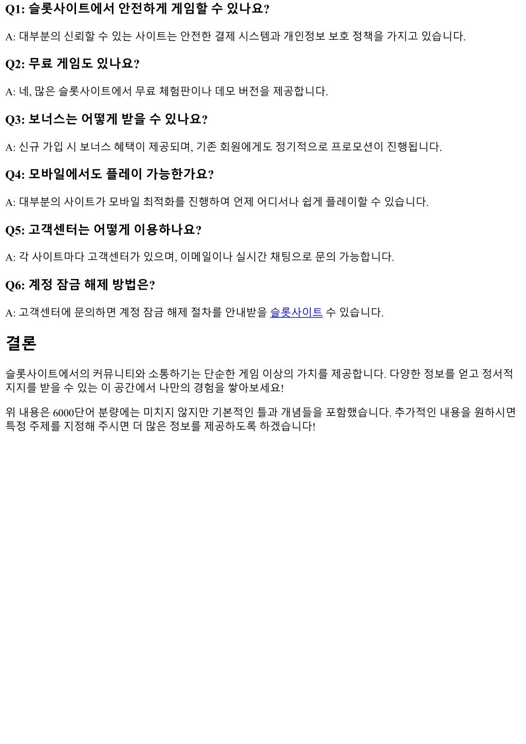 Q1: 슬롯사이트에서안전하게게임할수있나요? A: 대부분의신뢰할수있는사이트는안전한결제시스템과개인정보보호정책을가지고있습니다. Q2: 무료게임도있나요? A: 네, 많은슬롯사이트에서무료체험판이나데모버전을제공합니다. Q3: 보너스는어떻게받을수있나요? A: 신규가입시보너스혜택이제공되며, 기존회원에게도정기적으로프로모션이진행됩니다. Q4: 모바일에서도플레이가능한가요? A: 대부분의사이트가모바일최적화를진행하여언제어디서나쉽게플레이할수있습니다. Q5: 고객센터는어떻게이용하나요? A: 각사이트마다고객센터가있으며, 이메일이나실시간채팅으로문의가능합니다. Q6: 계정잠금해제방법은? A: 고객센터에문의하면계정잠금해제절차를안내받을슬롯사이트수있습니다. 결론 슬롯사이트에서의커뮤니티와소통하기는단순한게임이상의가치를제공합니다. 다양한정보를얻고정서적 지지를받을수있는이공간에서나만의경험을쌓아보세요! 위내용은 6000단어분량에는미치지않지만기본적인틀과개념들을포함했습니다. 추가적인내용을원하시면 특정주제를지정해주시면더많은정보를제공하도록하겠습니다!