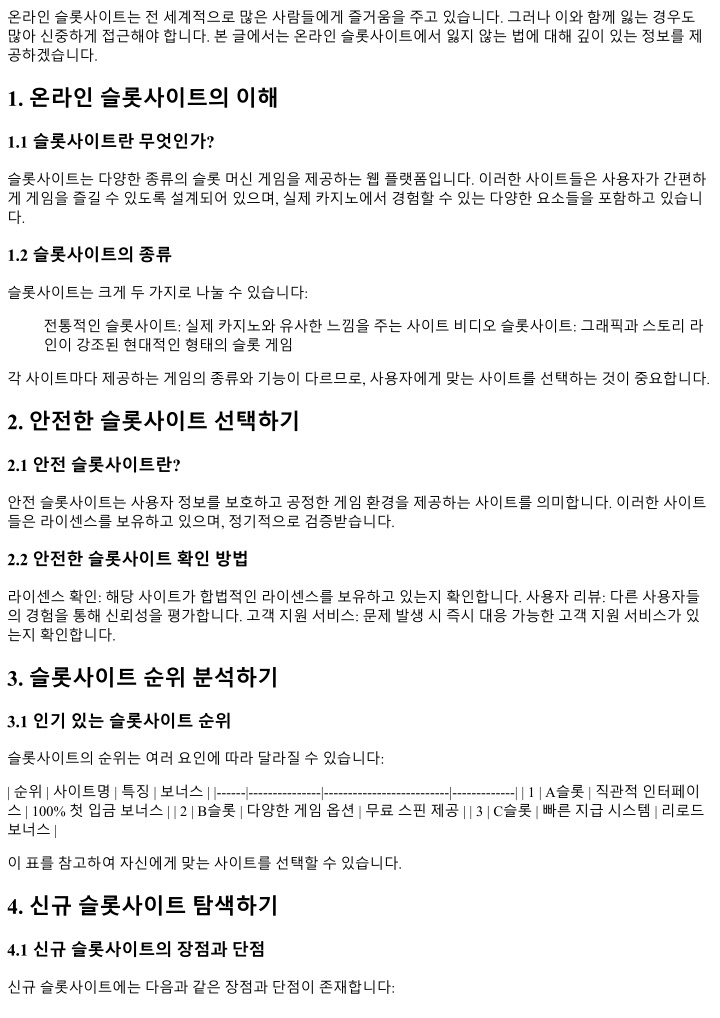 온라인슬롯사이트는전세계적으로많은사람들에게즐거움을주고있습니다. 그러나이와함께잃는경우도 많아신중하게접근해야합니다. 본글에서는온라인슬롯사이트에서잃지않는법에대해깊이있는정보를제 공하겠습니다. 1. 온라인슬롯사이트의이해 1.1 슬롯사이트란무엇인가? 슬롯사이트는다양한종류의슬롯머신게임을제공하는웹플랫폼입니다. 이러한사이트들은사용자가간편하 게게임을즐길수있도록설계되어있으며, 실제카지노에서경험할수있는다양한요소들을포함하고있습니 다. 1.2 슬롯사이트의종류 슬롯사이트는크게두가지로나눌수있습니다: 전통적인슬롯사이트: 실제카지노와유사한느낌을주는사이트비디오슬롯사이트: 그래픽과스토리라 인이강조된현대적인형태의슬롯게임 각사이트마다제공하는게임의종류와기능이다르므로, 사용자에게맞는사이트를선택하는것이중요합니다. 2. 안전한슬롯사이트선택하기 2.1 안전슬롯사이트란? 안전슬롯사이트는사용자정보를보호하고공정한게임환경을제공하는사이트를의미합니다. 이러한사이트 들은라이센스를보유하고있으며, 정기적으로검증받습니다. 2.2 안전한슬롯사이트확인방법 라이센스확인: 해당사이트가합법적인라이센스를보유하고있는지확인합니다. 사용자리뷰: 다른사용자들 의경험을통해신뢰성을평가합니다. 고객지원서비스: 문제발생시즉시대응가능한고객지원서비스가있 는지확인합니다. 3. 슬롯사이트순위분석하기 3.1 인기있는슬롯사이트순위 슬롯사이트의순위는여러요인에따라달라질수있습니다: | 순위 | 사이트명 | 특징 | 보너스 | |------|---------------|--------------------------|-------------| | 1 | A슬롯 | 직관적인터페이 스 | 100% 첫입금보너스 | | 2 | B슬롯 | 다양한게임옵션 | 무료스핀제공 | | 3 | C슬롯 | 빠른지급시스템 | 리로드 보너스 | 이표를참고하여자신에게맞는사이트를선택할수있습니다. 4. 신규슬롯사이트탐색하기 4.1 신규슬롯사이트의장점과단점 신규슬롯사이트에는다음과같은장점과단점이존재합니다: