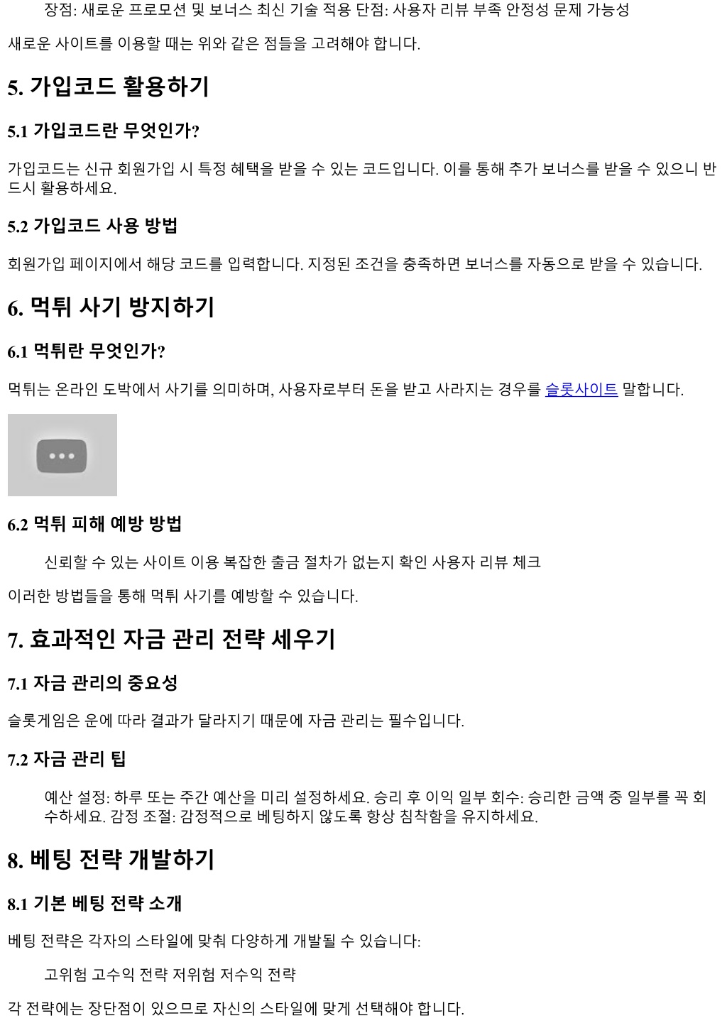 장점: 새로운프로모션및보너스최신기술적용단점: 사용자리뷰부족안정성문제가능성 새로운사이트를이용할때는위와같은점들을고려해야합니다. 5. 가입코드활용하기 5.1 가입코드란무엇인가? 가입코드는신규회원가입시특정혜택을받을수있는코드입니다. 이를통해추가보너스를받을수있으니반 드시활용하세요. 5.2 가입코드사용방법 회원가입페이지에서해당코드를입력합니다. 지정된조건을충족하면보너스를자동으로받을수있습니다. 6. 먹튀사기방지하기 6.1 먹튀란무엇인가? 먹튀는온라인도박에서사기를의미하며, 사용자로부터돈을받고사라지는경우를슬롯사이트말합니다. 6.2 먹튀피해예방방법 신뢰할수있는사이트이용복잡한출금절차가없는지확인사용자리뷰체크 이러한방법들을통해먹튀사기를예방할수있습니다. 7. 효과적인자금관리전략세우기 7.1 자금관리의중요성 슬롯게임은운에따라결과가달라지기때문에자금관리는필수입니다. 7.2 자금관리팁 예산설정: 하루또는주간예산을미리설정하세요. 승리후이익일부회수: 승리한금액중일부를꼭회 수하세요. 감정조절: 감정적으로베팅하지않도록항상침착함을유지하세요. 8. 베팅전략개발하기 8.1 기본베팅전략소개 베팅전략은각자의스타일에맞춰다양하게개발될수있습니다: 고위험고수익전략저위험저수익전략 각전략에는장단점이있으므로자신의스타일에맞게선택해야합니다.