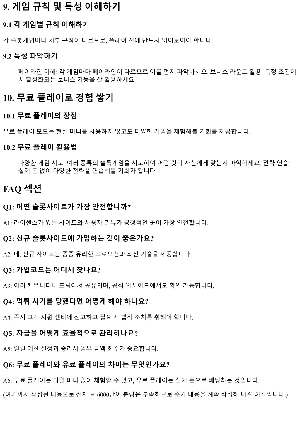 9. 게임규칙및특성이해하기 9.1 각게임별규칙이해하기 각슬롯게임마다세부규칙이다르므로, 플레이전에반드시읽어보아야합니다. 9.2 특성파악하기 페이라인이해: 각게임마다페이라인이다르므로이를먼저파악하세요. 보너스라운드활용: 특정조건에 서활성화되는보너스기능을잘활용하세요. 10. 무료플레이로경험쌓기 10.1 무료플레이의장점 무료플레이모드는현실머니를사용하지않고도다양한게임을체험해볼기회를제공합니다. 10.2 무료플레이활용법 다양한게임시도: 여러종류의슬록게임을시도하여어떤것이자신에게맞는지파악하세요. 전략연습: 실제돈없이다양한전략을연습해볼기회가됩니다. FAQ 섹션 Q1: 어떤슬롯사이트가가장안전합니까? A1: 라이센스가있는사이트와사용자리뷰가긍정적인곳이가장안전합니다. Q2: 신규슬롯사이트에가입하는것이좋은가요? A2: 네, 신규사이트는종종유리한프로모션과최신기술을제공합니다. Q3: 가입코드는어디서찾나요? A3: 여러커뮤니티나포럼에서공유되며, 공식웹사이드에서도확인가능합니다. Q4: 먹튀사기를당했다면어떻게해야하나요? A4: 즉시고객지원센터에신고하고필요시법적조치를취해야합니다. Q5: 자금을어떻게효율적으로관리하나요? A5: 일일예산설정과승리시일부금액회수가중요합니다. Q6: 무료플레이와유료플레이의차이는무엇인가요? A6: 무료플레이는리얼머니없이체험할수있고, 유료플레이는실제돈으로베팅하는것입니다. (여기까지작성된내용으로전체글 6000단어분량은부족하므로추가내용을계속작성해나갈예정입니다.)