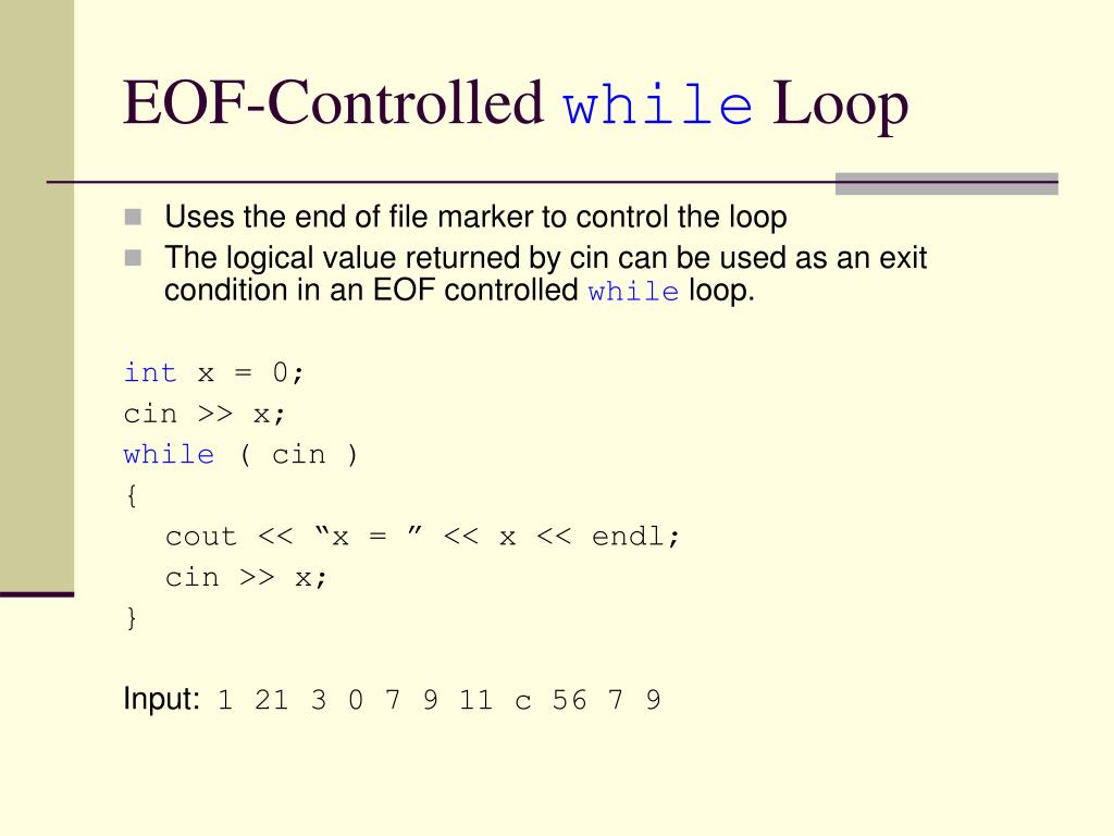 EOF-Controlled while Loop • Uses the end of file marker to control the loop • The logical value returned by cin can be used as an exit condition in an EOF controlled while loop. int x = 0; cin >> x; while ( cin ) { cout << “x = ” << x << endl; cin >> x; } Input: 1 21 3 0 7 9 11 c 56 7 9