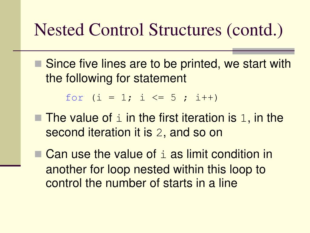 Nested Control Structures (contd.) • Since five lines are to be printed, we start with the following for statement for (i = 1; i <= 5 ; i++) • The value of i in the first iteration is 1, in the second iteration it is 2, and so on • Can use the value of i as limit condition in another for loop nested within this loop to control the number of starts in a line