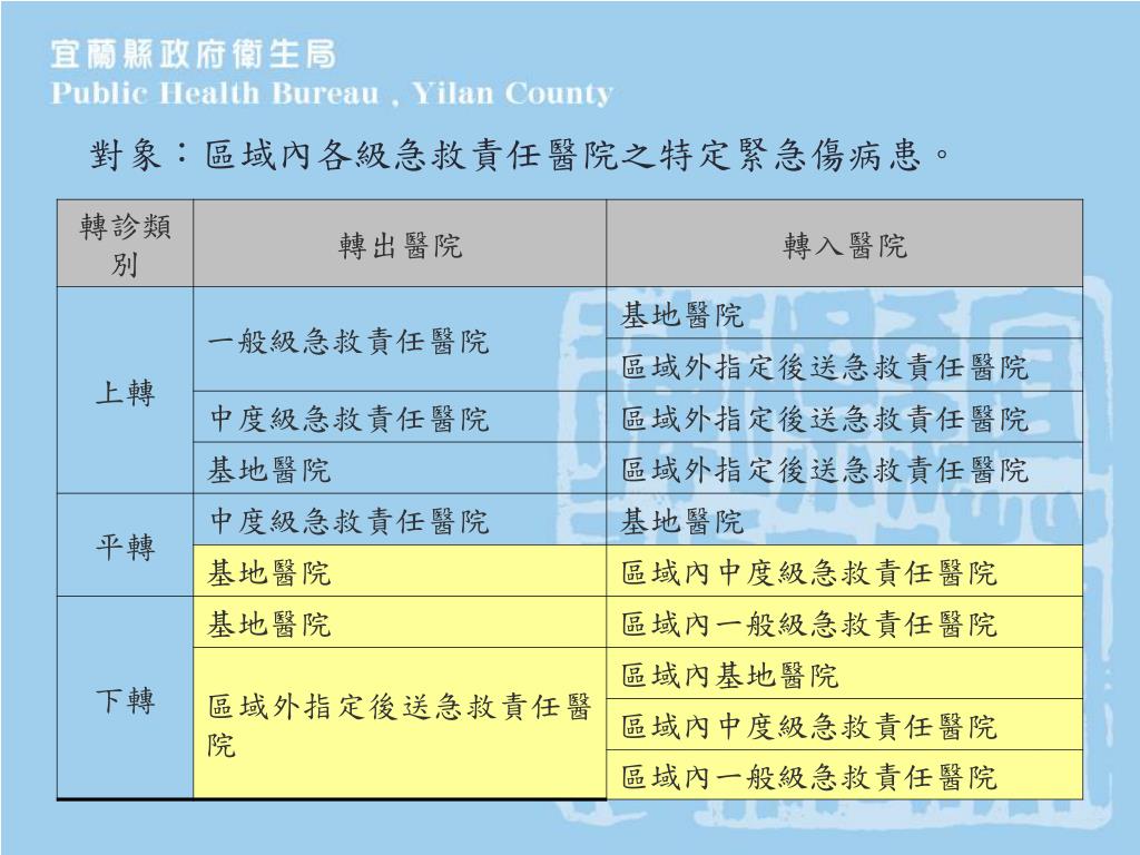 對象:區域內各級急救責任醫院之特定緊急傷病患。對象:區域內各級急救責任醫院之特定緊急傷病患。