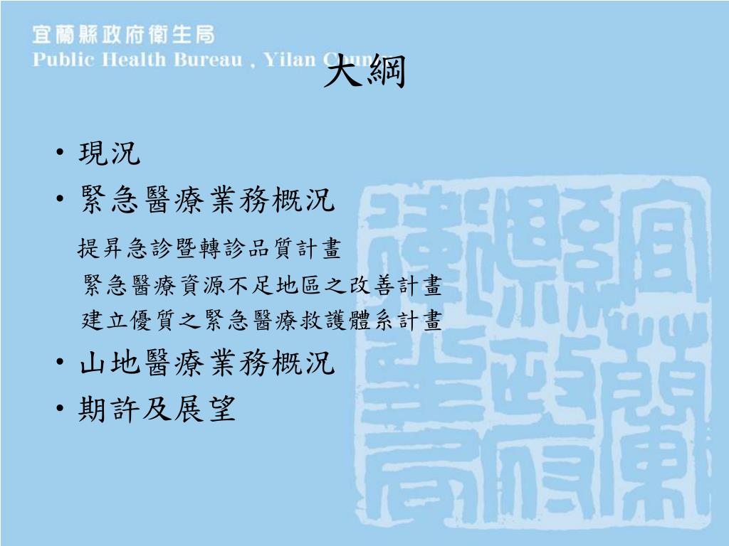 大綱 • 現況 • 緊急醫療業務概況 提昇急診暨轉診品質計畫 緊急醫療資源不足地區之改善計畫 建立優質之緊急醫療救護體系計畫 • 山地醫療業務概況 • 期許及展望
