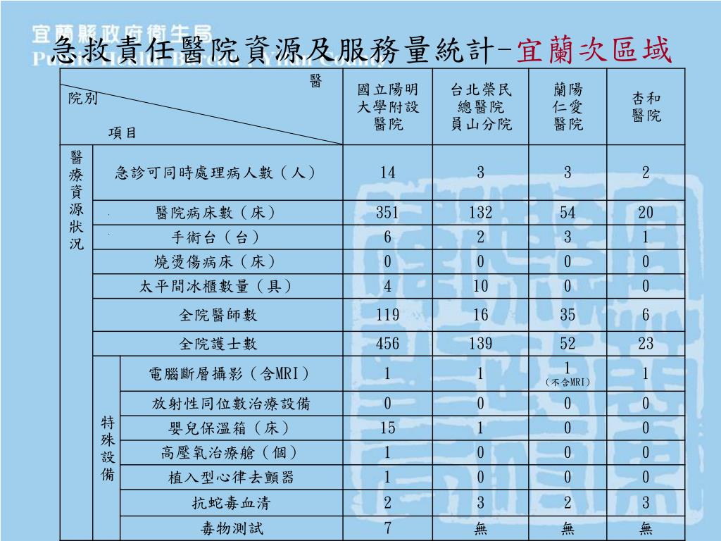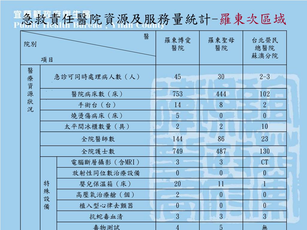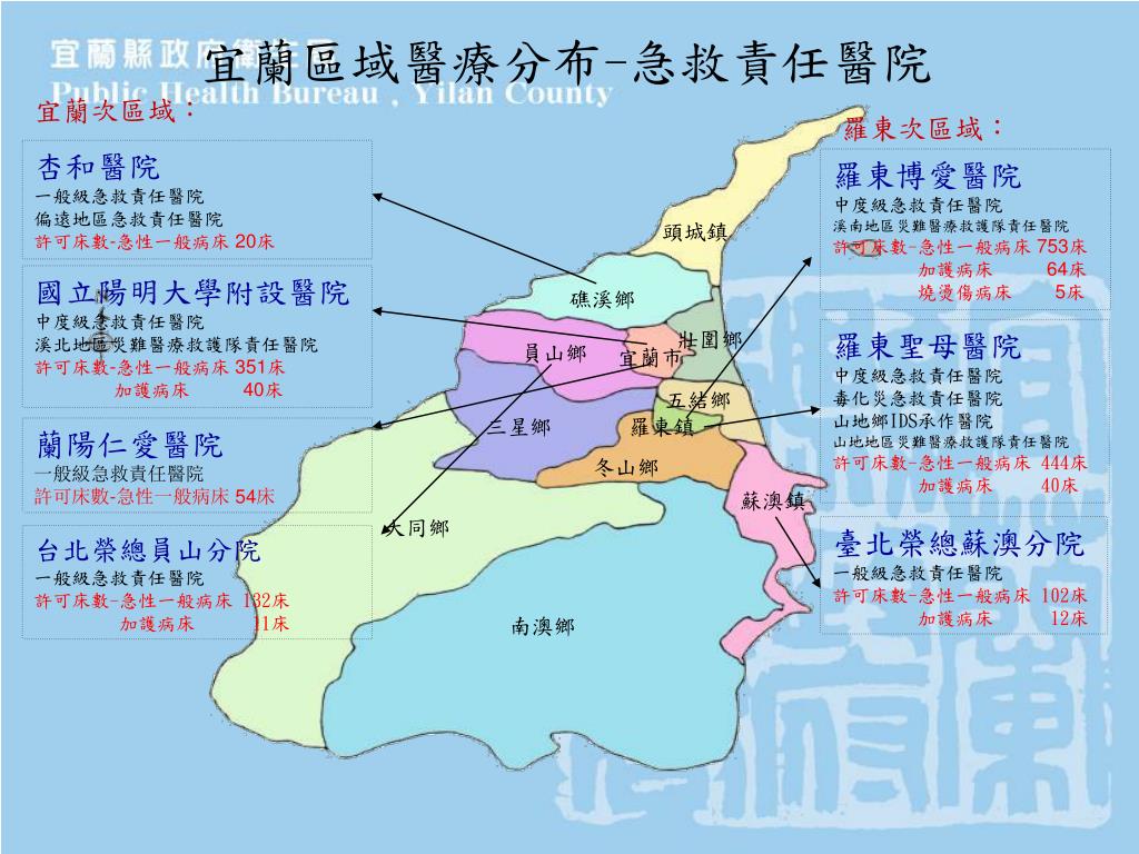 宜蘭區域醫療分布-急救責任醫院 宜蘭次區域: 羅東次區域: 杏和醫院 一般級急救責任醫院 偏遠地區急救責任醫院 許可床數-急性一般病床 20床 羅東博愛醫院 中度級急救責任醫院 溪南地區災難醫療救護隊責任醫院 許可床數-急性一般病床 753床 加護病床 64床 燒燙傷病床 5床 頭城鎮 國立陽明大學附設醫院 中度級急救責任醫院 溪北地區災難醫療救護隊責任醫院 許可床數-急性一般病床 351床 加護病床 40床 礁溪鄉 壯圍鄉 羅東聖母醫院 中度級急救責任醫院 毒化災急救責任醫院 山地鄉IDS承作醫院 山地地區災難醫療救護隊責任醫院 許可床數-急性一般病床 444床 加護病床 40床 員山鄉 宜蘭市 五結鄉 三星鄉 羅東鎮 蘭陽仁愛醫院 一般級急救責任醫院 許可床數-急性一般病床 54床 冬山鄉 蘇澳鎮 大同鄉 臺北榮總蘇澳分院 一般級急救責任醫院 許可床數-急性一般病床 102床 加護病床 12床 台北榮總員山分院 一般級急救責任醫院 許可床數-急性一般病床 132床 加護病床 11床 南澳鄉