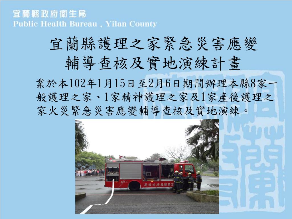 宜蘭縣護理之家緊急災害應變輔導查核及實地演練計畫宜蘭縣護理之家緊急災害應變輔導查核及實地演練計畫 業於本102年1月15日至2月6日期間辦理本縣8家一般護理之家、1家精神護理之家及1家產後護理之家火災緊急災害應變輔導查核及實地演練。