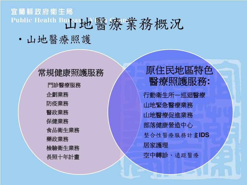 六、山地離島地區醫療給付效益提升計畫 Integrated Delivery System,簡稱IDS 大同鄉及南澳鄉偏遠山地鄉醫療照護,由中央健康保險局台北區業務組委託本縣羅東聖母醫院+陽大附醫,實施IDS整合醫療服務計畫,藉由該計畫實施提供山地鄉可近性醫療服務。