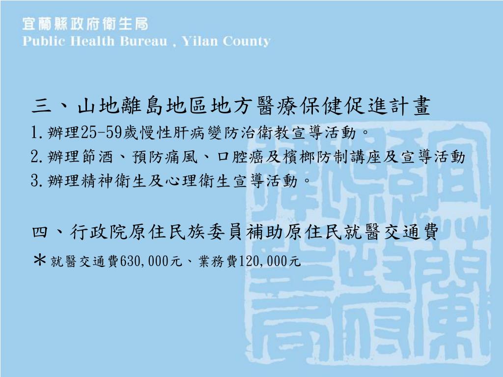三、山地離島地區地方醫療保健促進計畫 1.辦理25-59歲慢性肝病變防治衛教宣導活動。 2.辦理節酒、預防痛風、口腔癌及檳榔防制講座及宣導活動 3.辦理精神衛生及心理衛生宣導活動。 四、行政院原住民族委員補助原住民就醫交通費 *就醫交通費630,000元、業務費120,000元