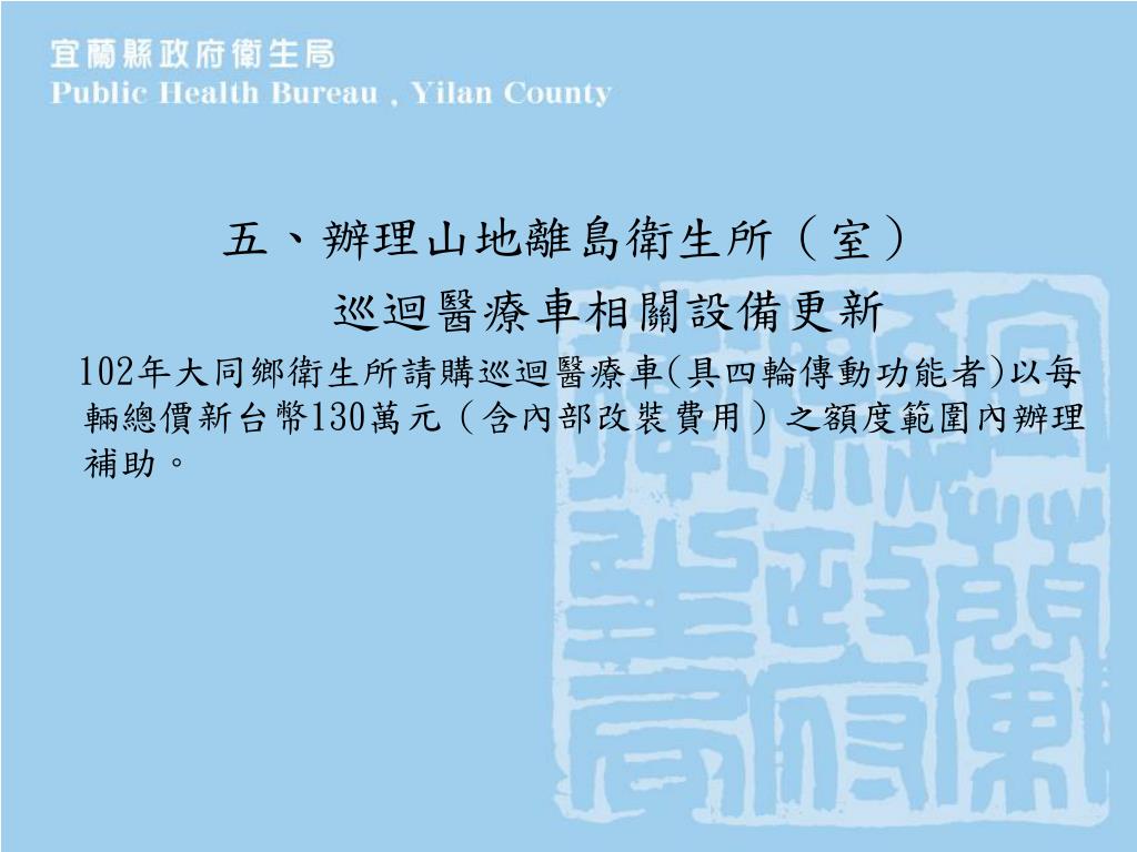 五、辦理山地離島衛生所(室) 巡迴醫療車相關設備更新 102年大同鄉衛生所請購巡迴醫療車(具四輪傳動功能者)以每輛總價新台幣130萬元(含內部改裝費用)之額度範圍內辦理補助。