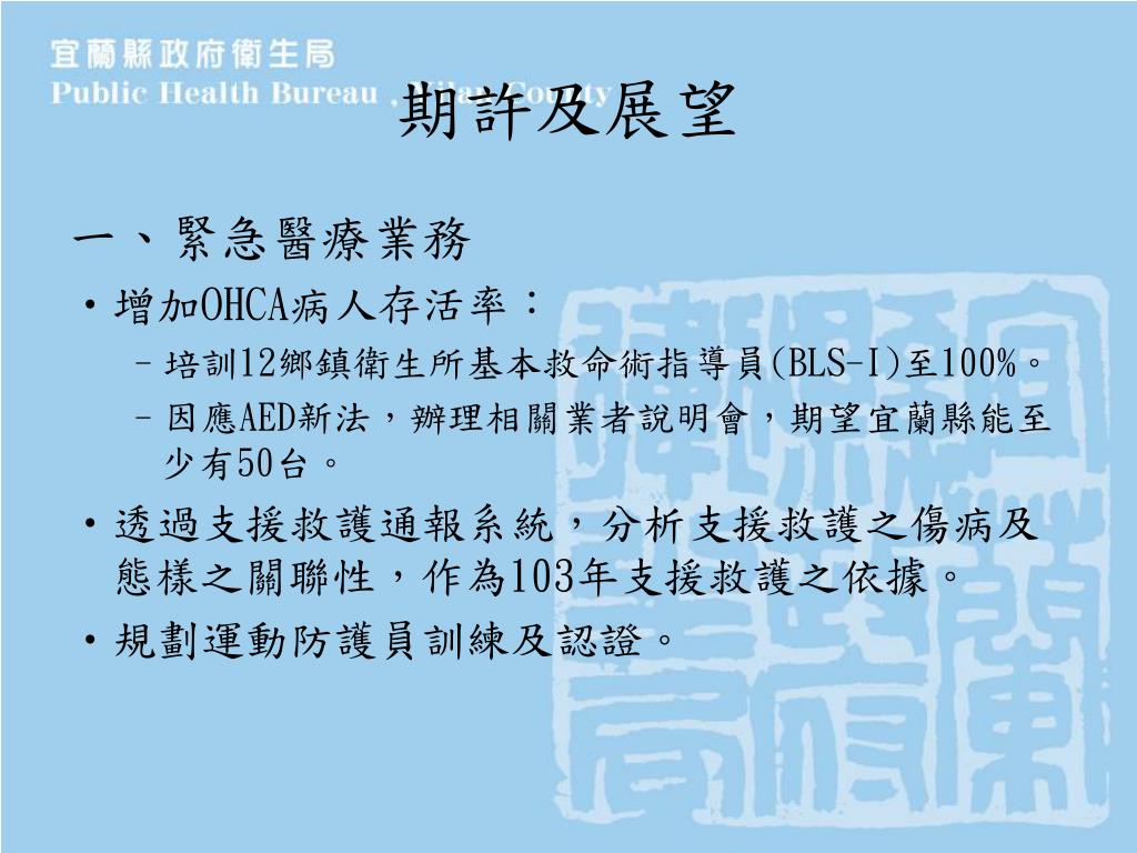 一、緊急醫療業務 增加OHCA病人存活率: 培訓12鄉鎮衛生所基本救命術指導員(BLS-I)至100%。 因應AED新法,辦理相關業者說明會,期望宜蘭縣能至少有50台。 透過支援救護通報系統,分析支援救護之傷病及態樣之關聯性,作為103年支援救護之依據。 規劃運動防護員訓練及認證。 期許及展望