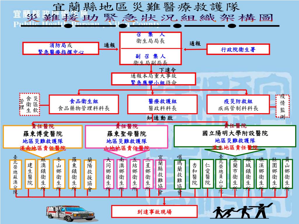 召 集 人 衛生局局長 副 召 集 人 衛生局副局長 宜蘭縣地區災難醫療救護隊 災難援助緊急狀況組織架構圖 通報 消防局或 緊急醫療指揮中心 通報 行政院衛生署 下達令 通報本局重大事故 緊急應變小組待命 災區飲食衛生管理 食品衛生組 食品藥物管理科科長 醫療救護組 醫政科科長 疫災防救組 疾病管制科科長 疫 情 監 測 啟動 通知 責任醫院 羅東博愛醫院 地區災難救護隊 溪南地區責任醫院 責任醫院 羅東聖母醫院 地區災難救護隊 山地地區責任醫院 責任醫院 國立陽明大學附設醫院 地區災難救護隊 溪北地區責任醫院 建生醫院 蘇澳鎮衛生所 杏和醫院 仁愛醫院 臺北榮總員山分院 宜蘭市衛生所 頭城鎮衛生所 礁溪鄉衛生所 壯圍鄉衛生所 員山鄉衛生所 冬山鄉衛生所 羅東鎮衛生所 大同鄉衛生所 南澳鄉衛生所 五結鄉衛生所 三星鄉衛生所 臺北榮總蘇澳分院 蘭陽救援協會 宜蘭縣救難協會 噶瑪蘭救難協會 到達事故現場