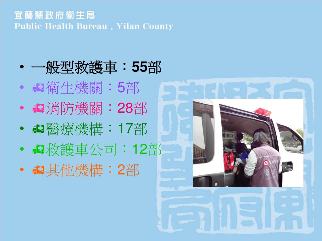 一般型救護車:55部 • 衛生機關:5部 • 消防機關:28部 • 醫療機構:17部 • 救護車公司:12部 • 其他機構:2部