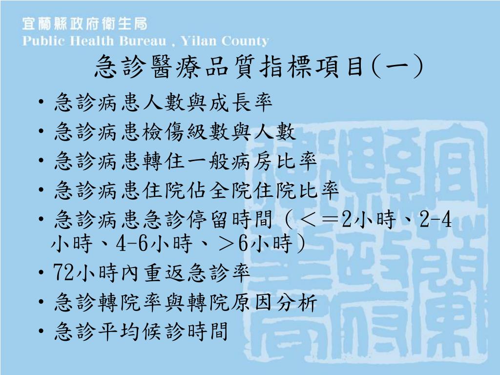 急診醫療品質指標項目(一) • 急診病患人數與成長率 • 急診病患檢傷級數與人數 • 急診病患轉住一般病房比率 • 急診病患住院佔全院住院比率 • 急診病患急診停留時間(<=2小時、2-4小時、4-6小時、>6小時) • 72小時內重返急診率 • 急診轉院率與轉院原因分析 • 急診平均候診時間