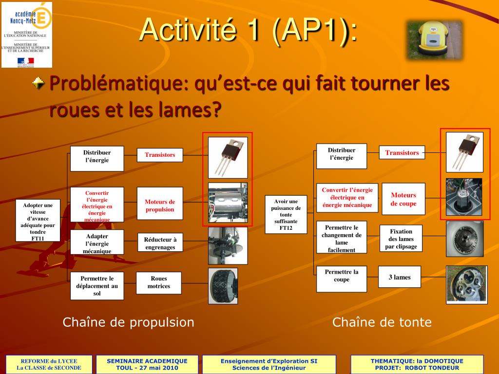 Convertir l’énergie électrique enénergie mécanique Moteurs de propulsion Distribuer l’énergie Transistors Moteurs de coupe Convertir l’énergie électrique en énergie mécanique Avoir une puissance de tonte suffisanteFT12 Permettre le changement de lame facilement Fixation des lames par clipsage Permettre la coupe 3 lames Activité 1 (AP1): • Problématique: qu’est-ce qui fait tourner les roues et les lames? Distribuer l’énergie Transistors Adopter une vitesse d’avance adéquate pour tondreFT11 Adapter l’énergie mécanique Réducteur à engrenages Permettre le déplacement au sol Roues motrices Chaîne de propulsion Chaîne de tonte