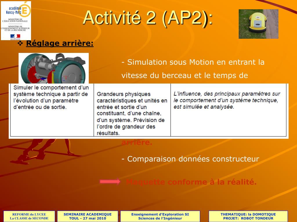 Activité 2 (AP2): • Réglage arrière: - Simulation sous Motion en entrant la vitesse du berceau et le temps de simulation. - Obtention des positions mini et maxi du berceau. Déplacement = hauteur du réglage arrière. - Comparaison données constructeur Maquette conforme à la réalité.