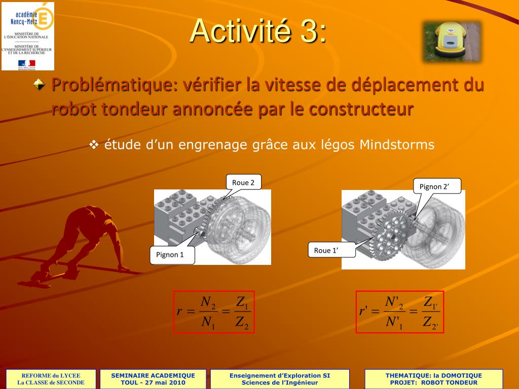 Roue 2 Pignon 1 Pignon 2’ Roue 1’ Activité 3: • Problématique: vérifier la vitesse de déplacement du robot tondeur annoncée par le constructeur • étude d’un engrenage grâce aux légos Mindstorms