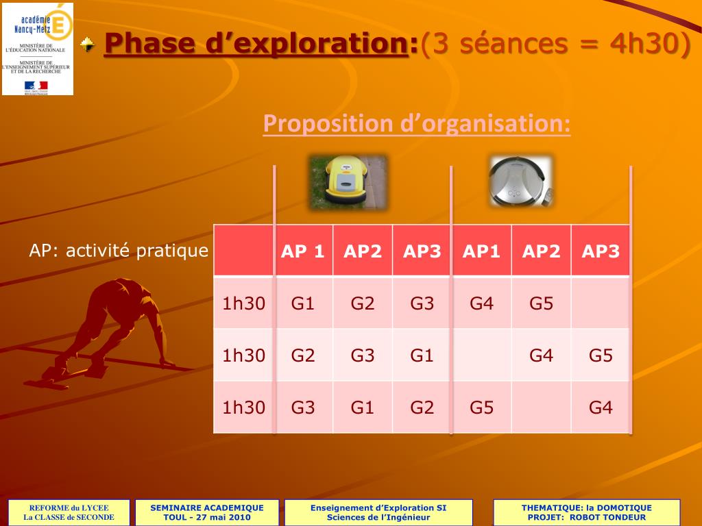 Phase de lancement :(1 séance = 1h30) • Présentation du thème • Présentation des supports: Ex: le robot tondeur • Présentation des notions abordées: la chaîne d’énergie Ex: le robot tondeur • Présentation des 3 activités pratiques Ex: le robot tondeur • Constitution des groupes: 20 élèves = 5 groupes de 4 élèves.