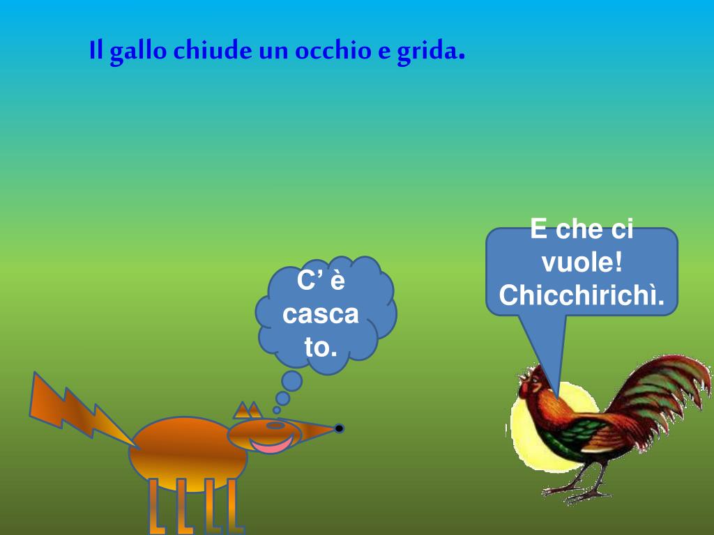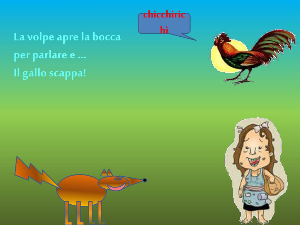 chicchirichì La volpe apre la bocca per parlare e … Il gallo scappa!