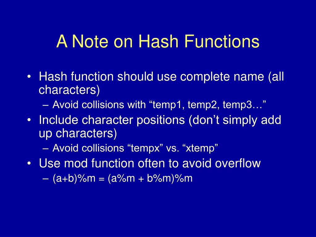 A Note on Hash Functions • Hash function should use complete name (all characters) • Avoid collisions with “temp1, temp2, temp3…” • Include character positions (don’t simply add up characters) • Avoid collisions “tempx” vs. “xtemp” • Use mod function often to avoid overflow • (a+b)%m = (a%m + b%m)%m