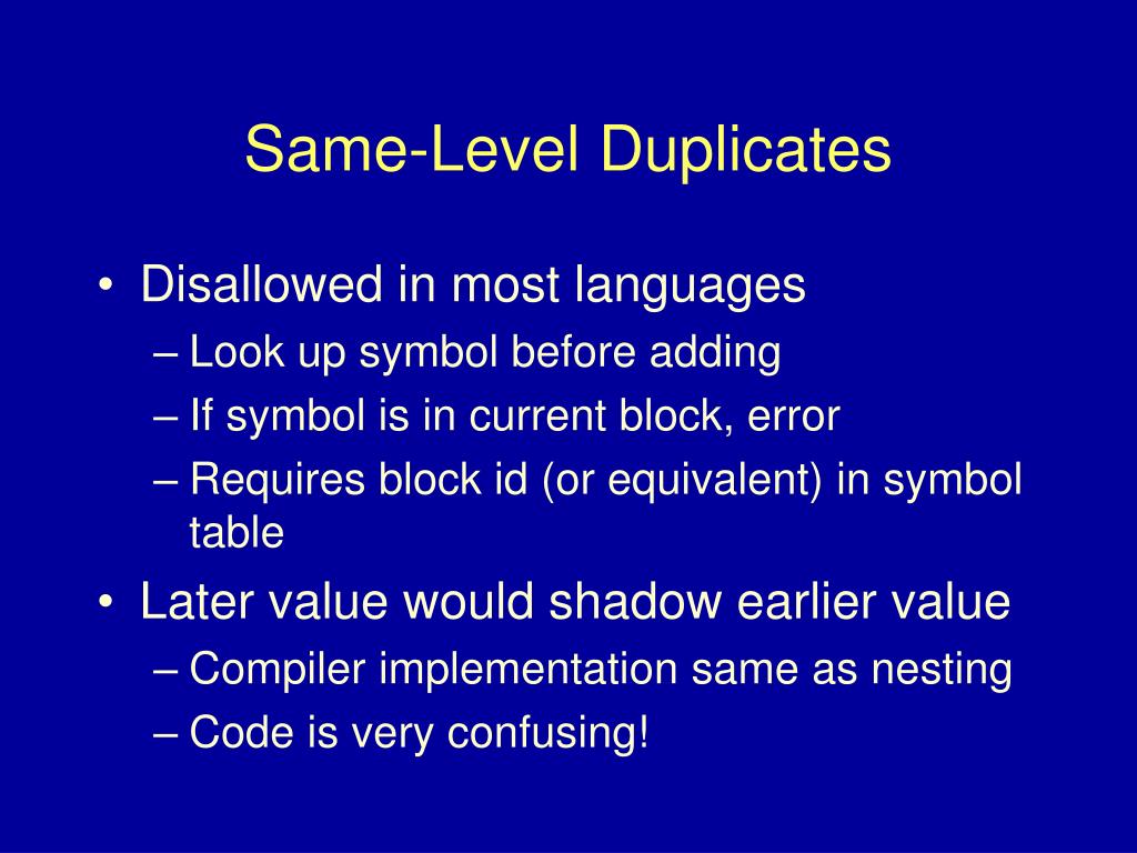Same-Level Duplicates • Disallowed in most languages • Look up symbol before adding • If symbol is in current block, error • Requires block id (or equivalent) in symbol table • Later value would shadow earlier value • Compiler implementation same as nesting • Code is very confusing!