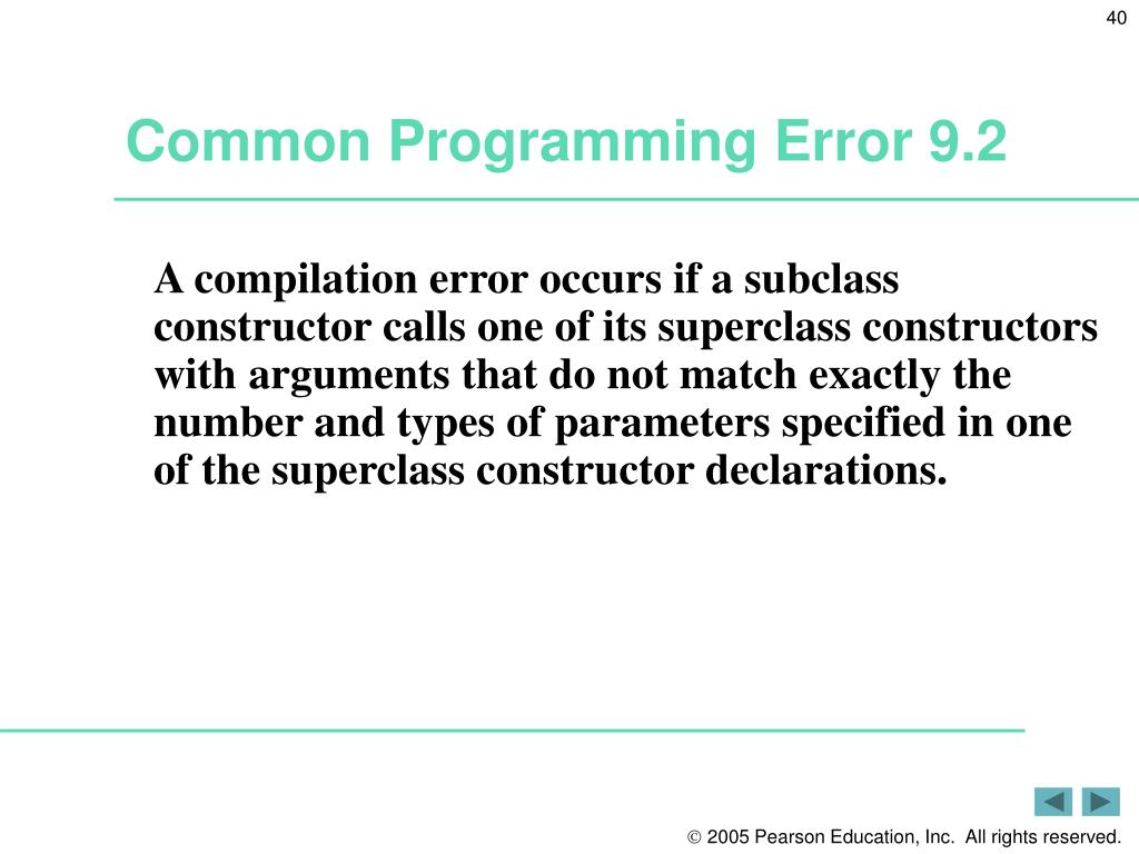 Common Programming Error 9.2 • A compilation error occurs if a subclass constructor calls one of its superclass constructors with arguments that do not match exactly the number and types of parameters specified in one of the superclass constructor declarations.