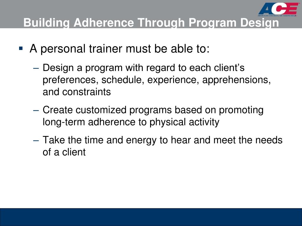 ACE Personal Trainer Manual, 4 th edition Chapter 2: Principles of Adherence and Motivation. 1. Introduction. Starting—and then sticking with—an exercise program is a significant challenge. There is a difference in motivation between starting and adhering to a program.