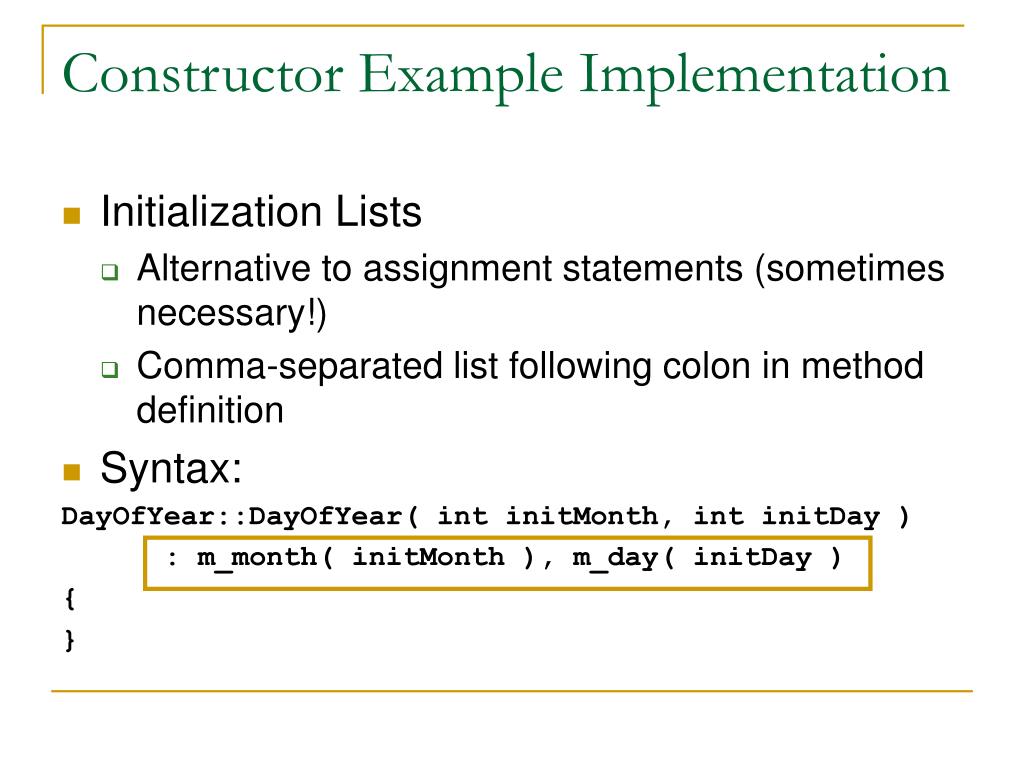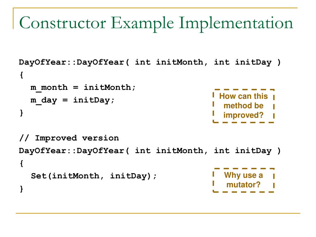 Constructor Example Implementation DayOfYear::DayOfYear( int initMonth, int initDay ) { m_month = initMonth; m_day = initDay; } // Improved version DayOfYear::DayOfYear( int initMonth, int initDay ) { Set(initMonth, initDay); } How can this method be improved? Why use a mutator?