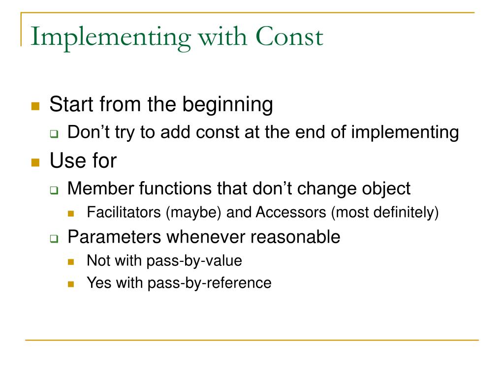 Implementing with Const • Start from the beginning • Don’t try to add const at the end of implementing • Use for • Member functions that don’t change object • Facilitators (maybe) and Accessors (most definitely) • Parameters whenever reasonable • Not with pass-by-value • Yes with pass-by-reference