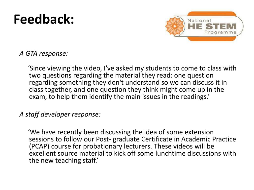 Feedback: A GTA response: ‘Since viewing the video, I've asked my students to come to class with two questions regarding the material they read: one question regarding something they don't understand so we can discuss it in class together, and one question they think might come up in the exam, to help them identify the main issues in the readings.’ A staff developer response: ‘We have recently been discussing the idea of some extension sessions to follow our Post- graduate Certificate in Academic Practice (PCAP) course for probationary lecturers. These videos will be excellent source material to kick off some lunchtime discussions with the new teaching staff.’
