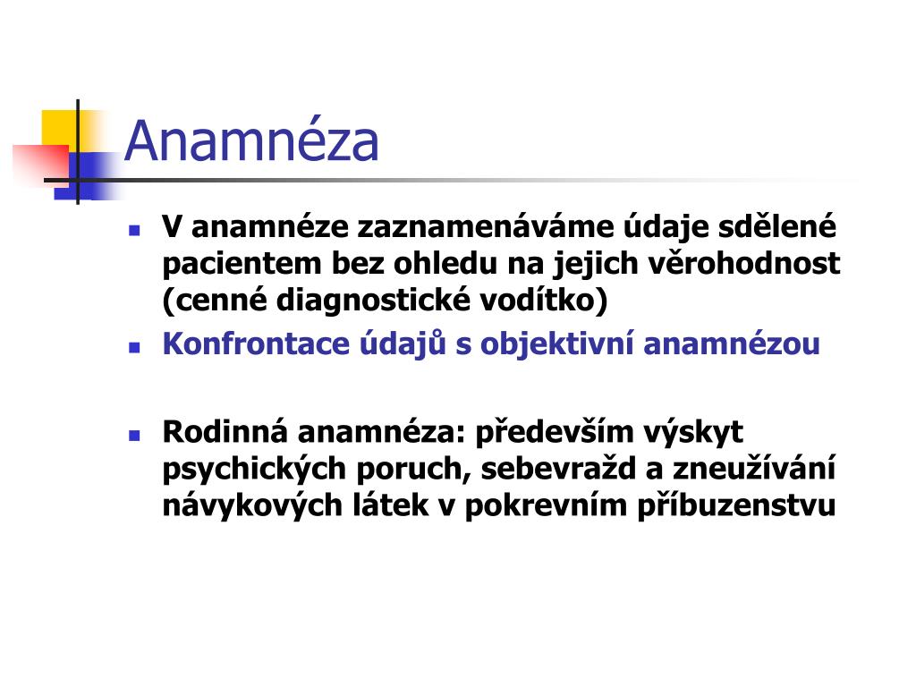 Anamnéza • V anamnéze zaznamenáváme údaje sdělené pacientem bez ohledu na jejich věrohodnost (cenné diagnostické vodítko) • Konfrontace údajů s objektivní anamnézou • Rodinná anamnéza: především výskyt psychických poruch, sebevražd a zneužívání návykových látek v pokrevním příbuzenstvu