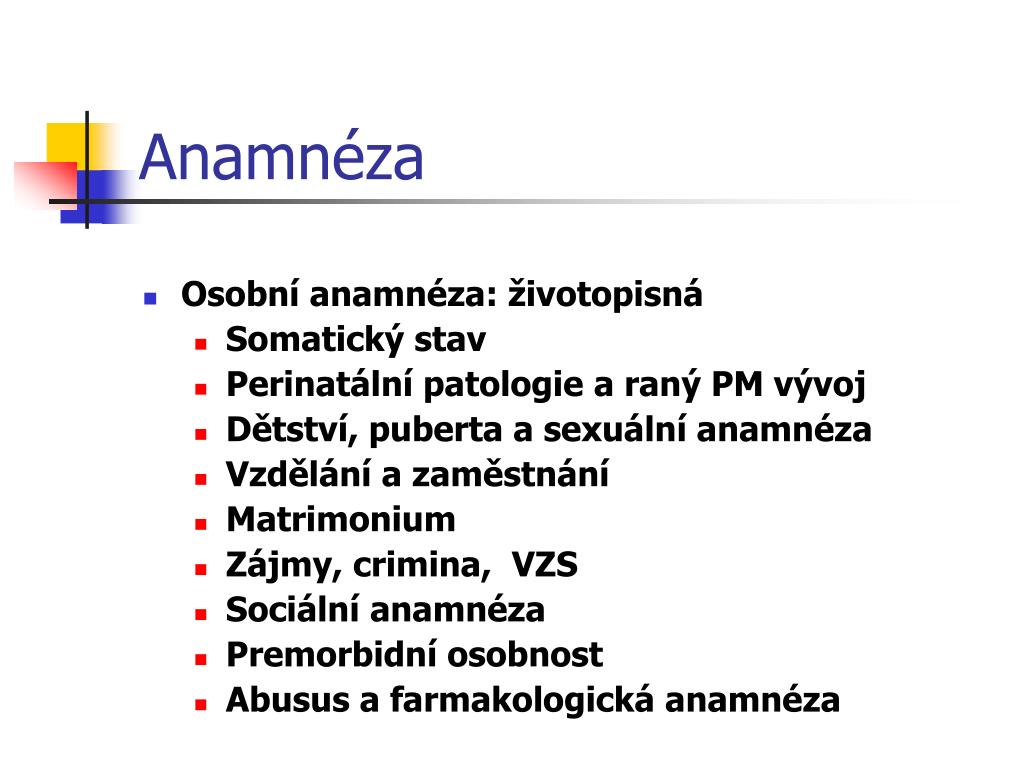Anamnéza • Osobní anamnéza: životopisná • Somatický stav • Perinatální patologie a raný PM vývoj • Dětství, puberta a sexuální anamnéza • Vzdělání a zaměstnání • Matrimonium • Zájmy, crimina, VZS • Sociální anamnéza • Premorbidní osobnost • Abusus a farmakologická anamnéza