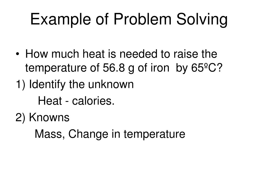 Example of Problem Solving • How much heat is needed to raise the temperature of 56.8 g of iron by 65ºC? 1) Identify the unknown Heat - calories. 2) Knowns Mass, Change in temperature