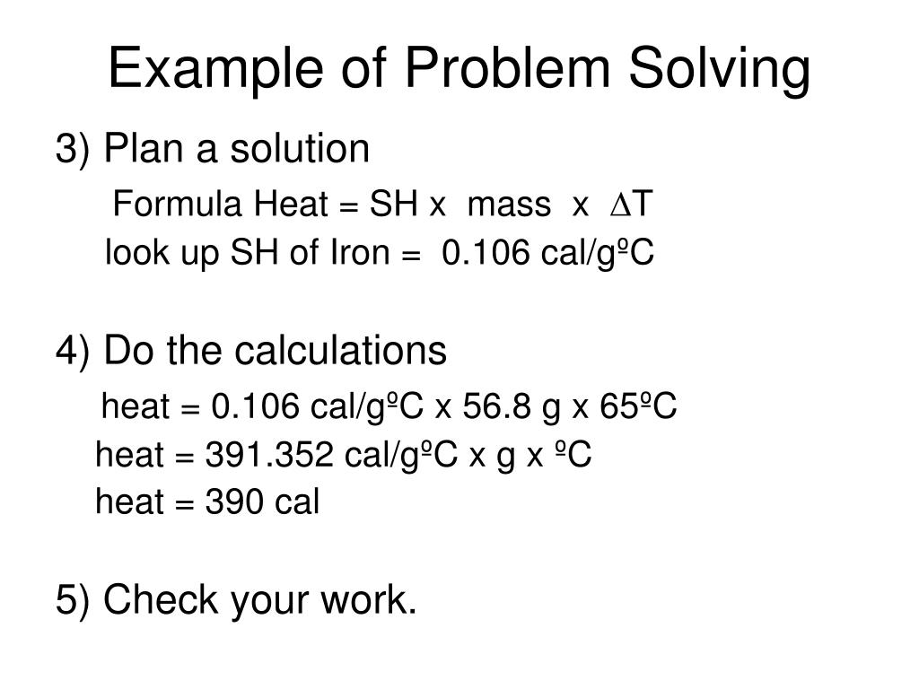 Example of Problem Solving 3) Plan a solution Formula Heat = SH x mass x DT look up SH of Iron = 0.106 cal/gºC 4) Do the calculations heat = 0.106 cal/gºC x 56.8 g x 65ºC heat = 391.352 cal/gºC x g x ºC heat = 390 cal 5) Check your work.