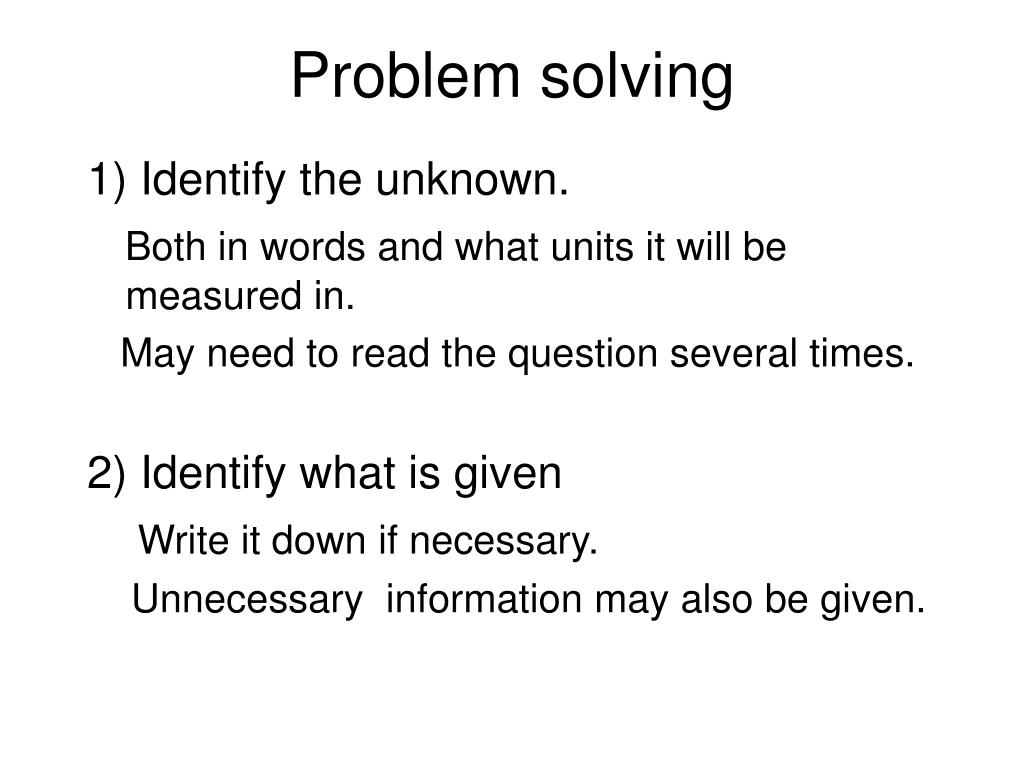 Problem solving 1) Identify the unknown. Both in words and what units it will be measured in. May need to read the question several times. 2) Identify what is given Write it down if necessary. Unnecessary information may also be given.