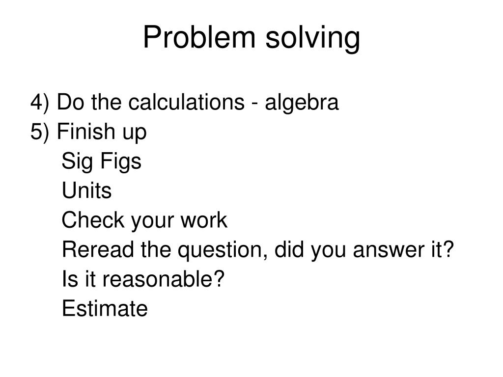 Problem solving 4) Do the calculations - algebra 5) Finish up Sig Figs Units Check your work Reread the question, did you answer it? Is it reasonable? Estimate