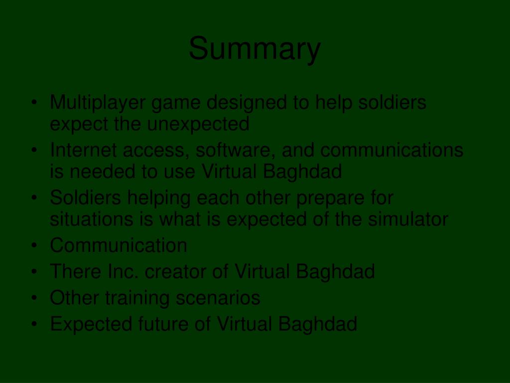 Summary • Multiplayer game designed to help soldiers expect the unexpected • Internet access, software, and communications is needed to use Virtual Baghdad • Soldiers helping each other prepare for situations is what is expected of the simulator • Communication • There Inc. creator of Virtual Baghdad • Other training scenarios • Expected future of Virtual Baghdad